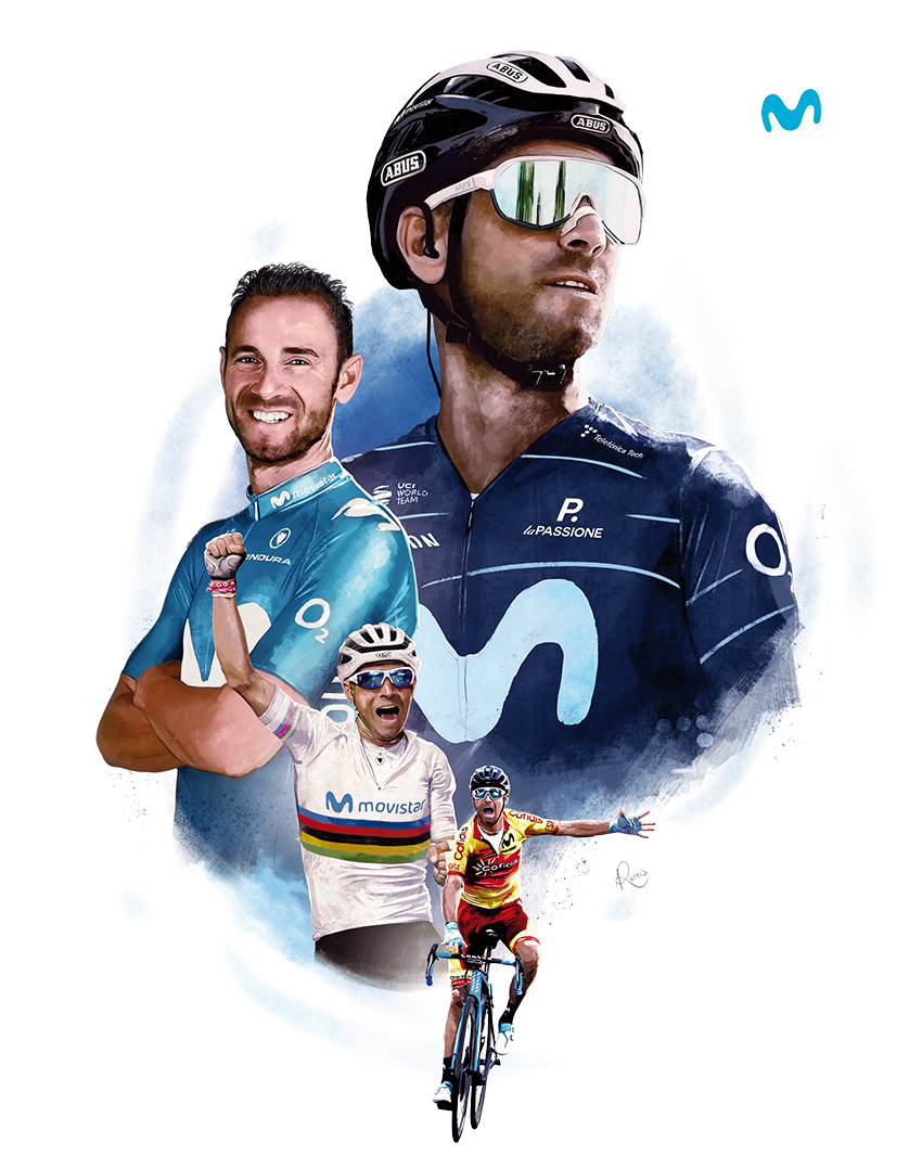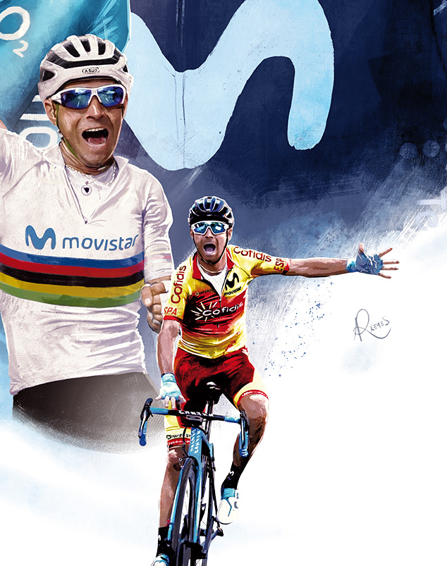 Illustration commissioned by Movistar Team for a mural homage to Alejandro Valverde. The brief was to showbest moments of Alejandro's career. An Spanish cycling icon who is officially retiring.
